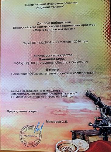 Диплом победителя Всероссийского конкурса исследовательских проектов "Мир в котором мы живем"