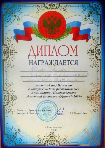 3 место в конкурсе "Юные растениеводы" областной выставки "Урожай 2008"