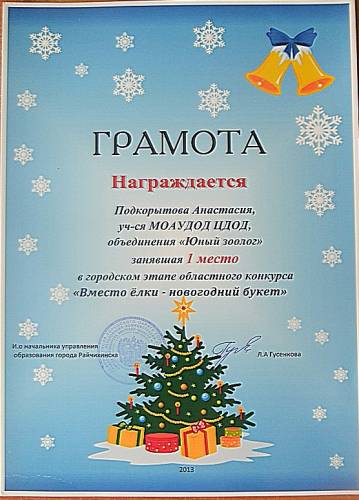 1 место в городском конкурсе "Вместо елки - новогодний букет"