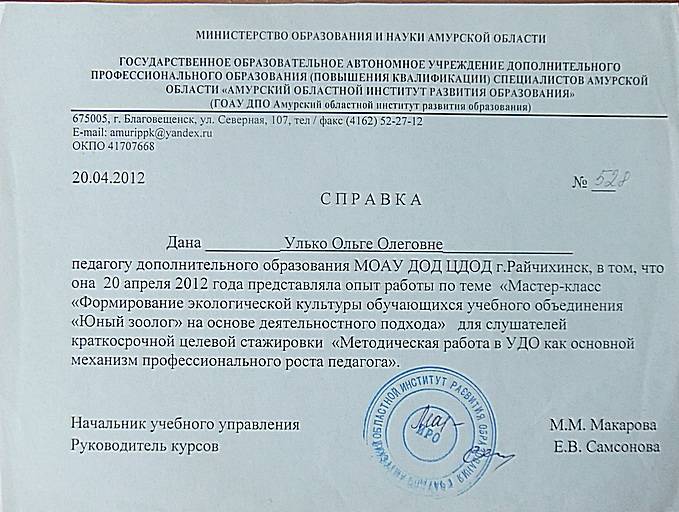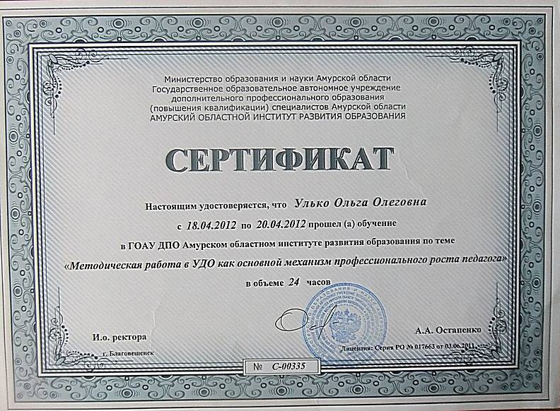 С 18.04.2012 по 20.04.2012 прошла обучение в ГОАУ ДПО Амурском областном институте развития образования по теме "Мето...