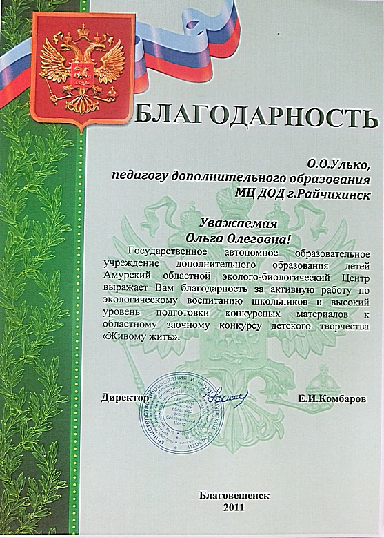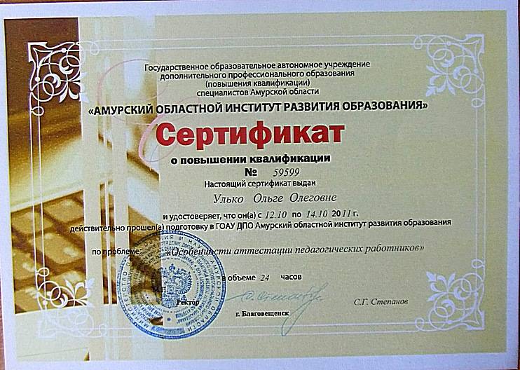 С 12.10.2011 по 14.10.2011 прошла подготовку в ГОАУ ДПО Амурский областной институт образования по теме: "Особенности...