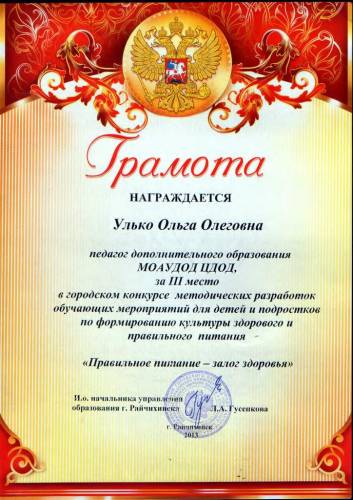 Городской конкурс методических разработок для детей и подростков по формированию культуры здорового и правильного питания. Призовое место - 3