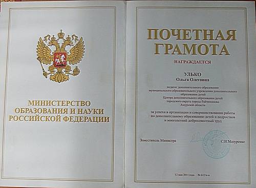 ФотоальбомыПочетная грамотаЗа успехи в организации и совершенствовании работы по дополнительному образованию детей