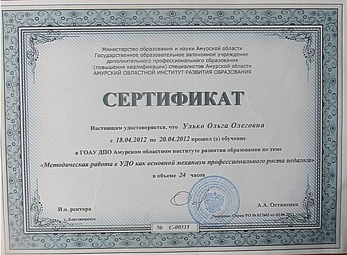ФотоальбомыСертификатС 18.04.2012 по 20.04.2012 прошла обучение в ГОАУ ДПО Амурском областном институте развития образования по теме "Методическая работа в УДО как основной механизм профессионального роста педагога"